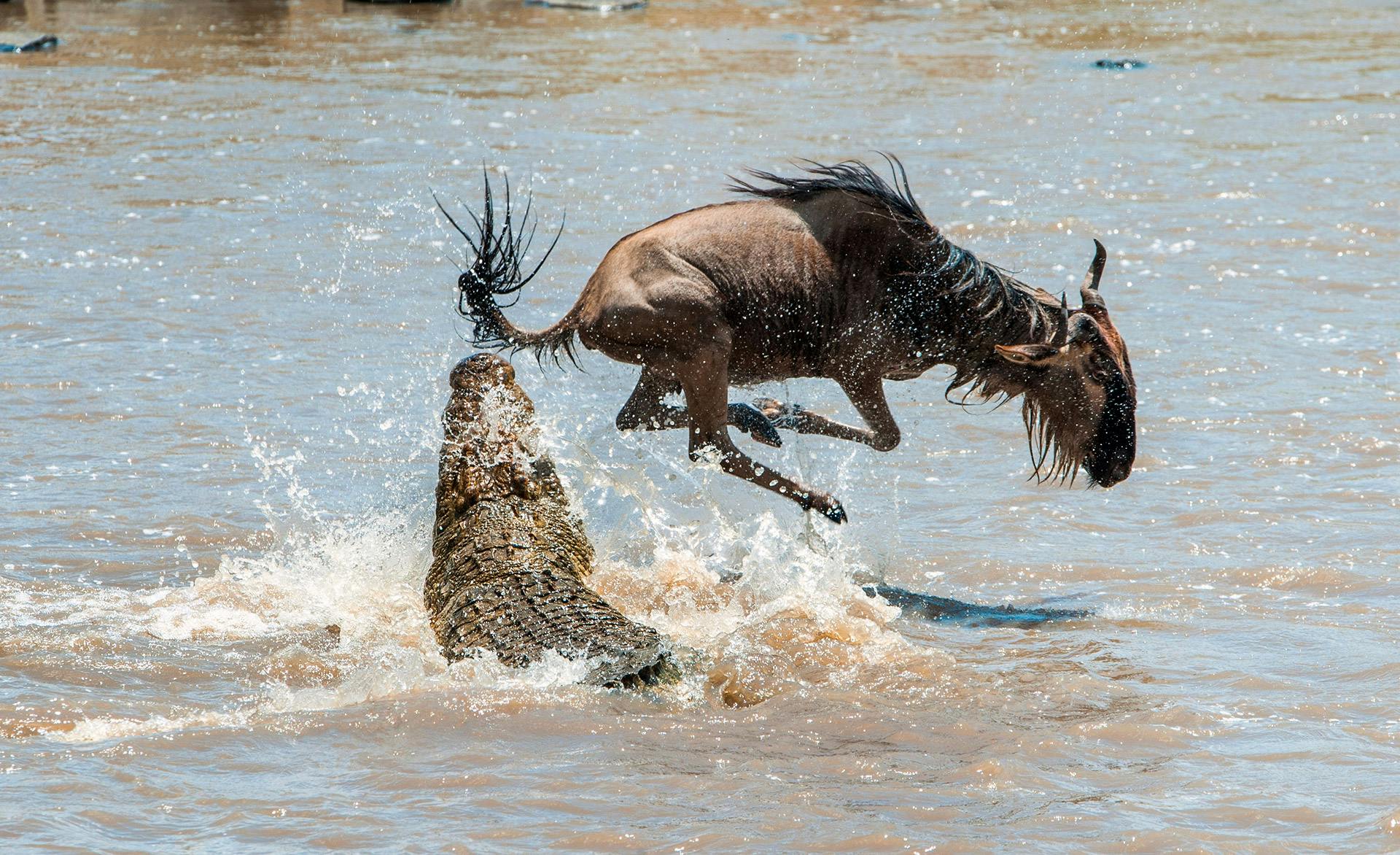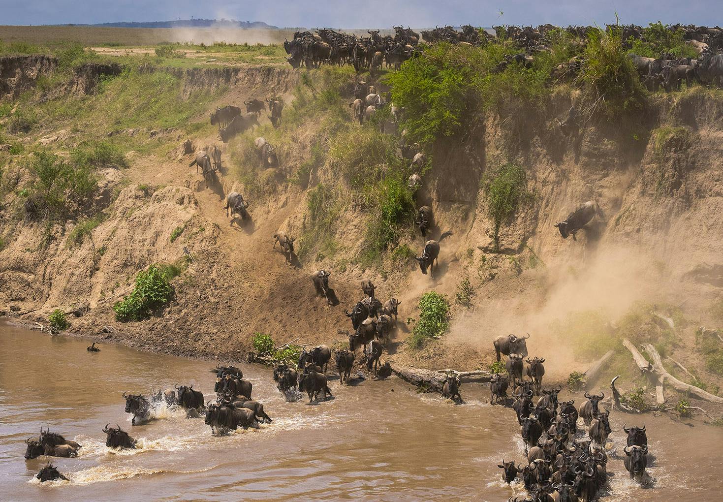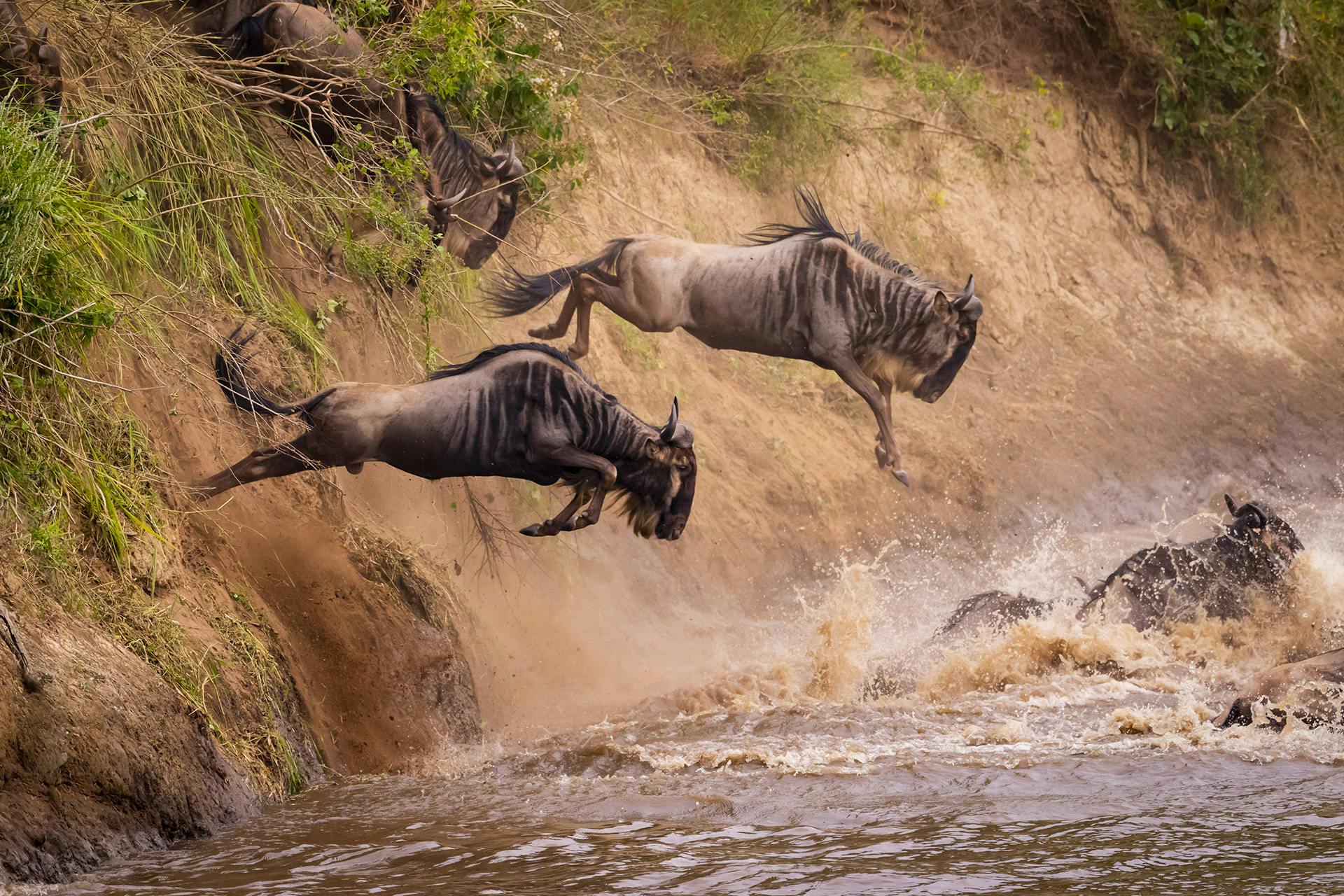 Dann, wie auf ein geheimes Zeichen, wagen sich die ersten Gnus den Abhang hinab – halb rutschend, halb springend – und stürzen sich in das Wasser, wo die Krokodile schon warten. Die nächsten folgen, bis sich schließlich ein stetiger Strom aus Tieren in den Mara ergießt. Sie alle wollen nur eines: das gegenüberliegende Ufer mit den Weidegründen der Massai Mara erreichen. Die meisten schaffen es, doch nicht alle.