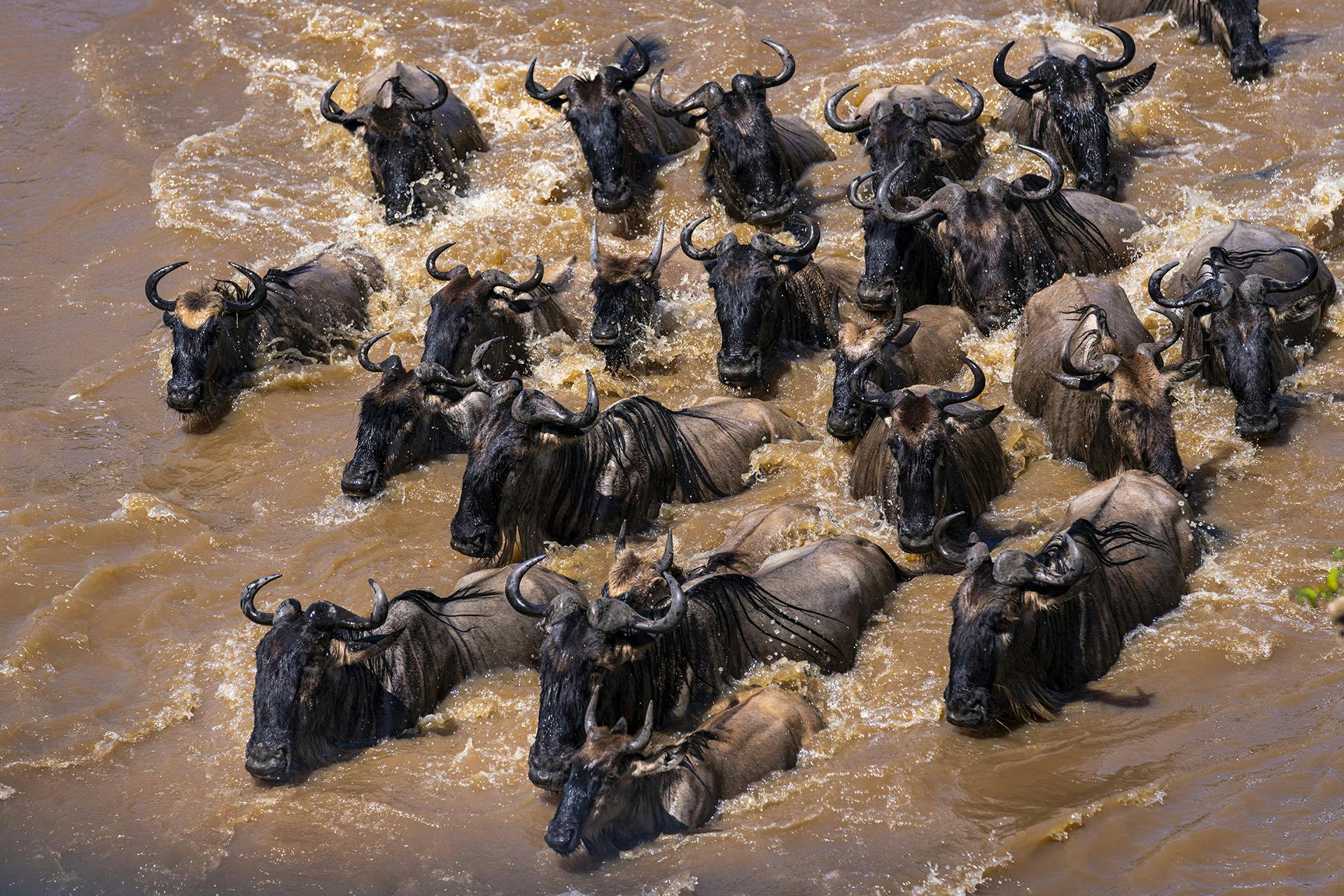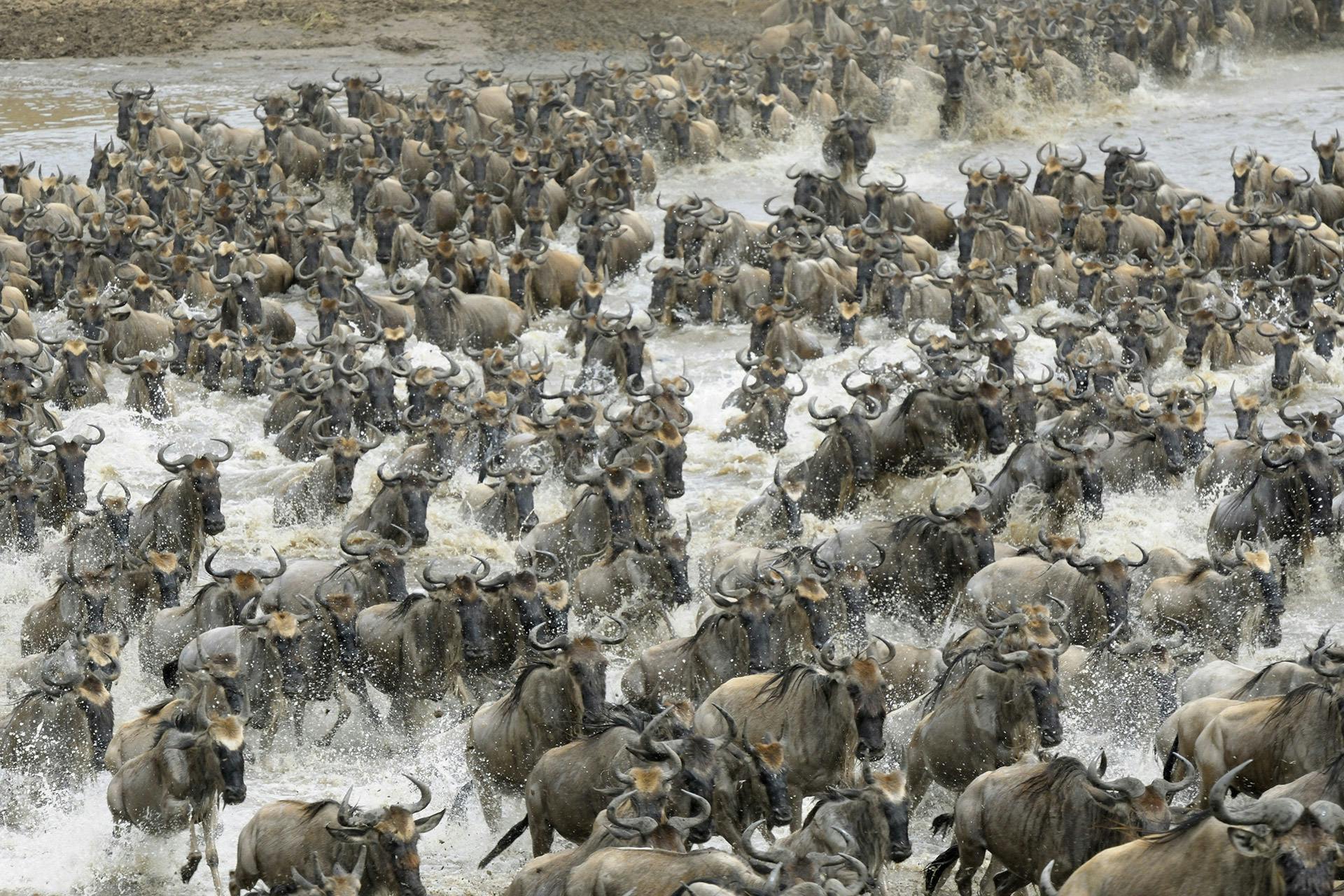 Es ist eine harte Reise, die Gefahr allgegenwärtig. Doch das wohl gefährlichste Wagnis ist die Überquerung des Flusses Mara an der Grenze zwischen Tansania und Kenia. Wenn die Gnus die steilen Böschungen des Mara erreichen, kommen sie zunächst zum Stehen. Immer mehr Tiere drängen von hinten nach. Dicht an dicht stehen sie schließlich, mit Blick nach vorne.